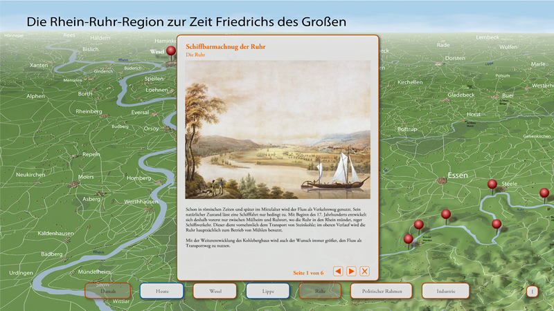 Ein detaillreiches dreidimensionales Panorama veranschaulicht das Ruhrgebiet am Vorabend der Industrialisierung. Der Betrachter kann direkte Vergleiche zwischen damals und heute anstellen, sich über die politische Situation oder die seinerzeit stattfindende Schiffbarmachung der Ruhr informieren.